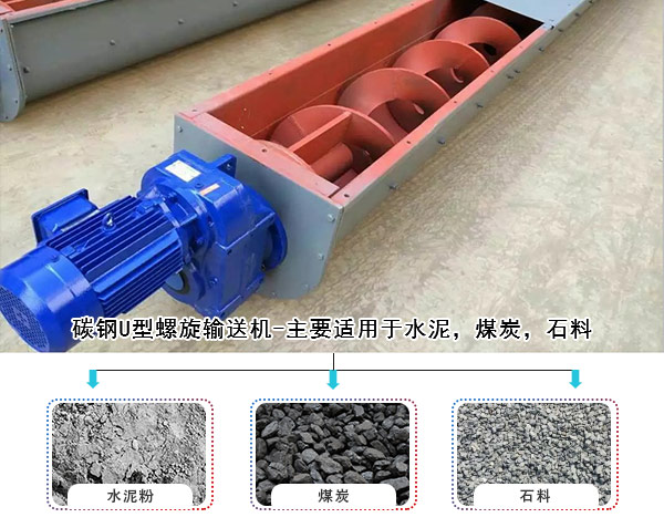 1,普通碳鋼U型螺旋輸送機-主要適用于水泥,煤炭,石料,等磨損較大,對物料沒有特殊要求的行業(yè)。