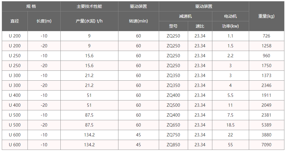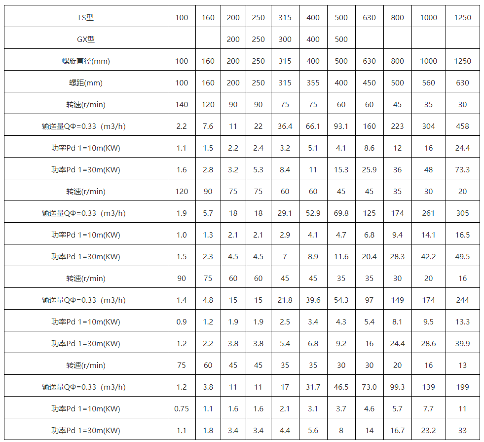 U型螺旋輸送機(jī)工作時,電機(jī)帶動旋轉(zhuǎn)的螺旋葉片將物料推移而進(jìn)行輸送,螺旋輸送機(jī)旋轉(zhuǎn)軸上焊的螺旋葉片,葉片的面型根據(jù)輸送物料的不同有實體面型、帶式面型、葉片面型等型式。使物料不與螺旋輸送機(jī)葉片一起旋轉(zhuǎn)的力是物料自身重量和螺旋輸送機(jī)機(jī)殼對物料的摩擦阻力。參數(shù)如下: