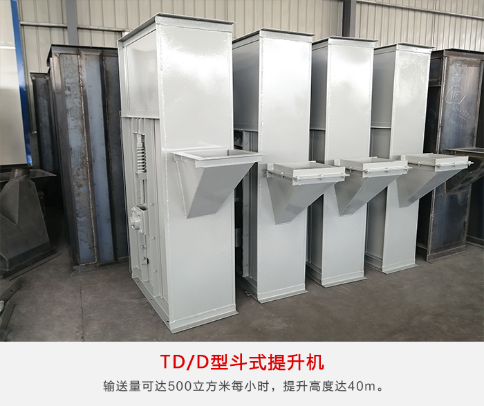 TD型斗式提升機由運行部分料斗與牽引膠帶、帶有傳動滾筒的 上部區段,帶有拉緊滾筒的下部區段,中間機殼,驅動裝置,逆止制動裝置等組成。無故障時間超過2萬小時,輸送量可達500m³/h,提升高度達40m。