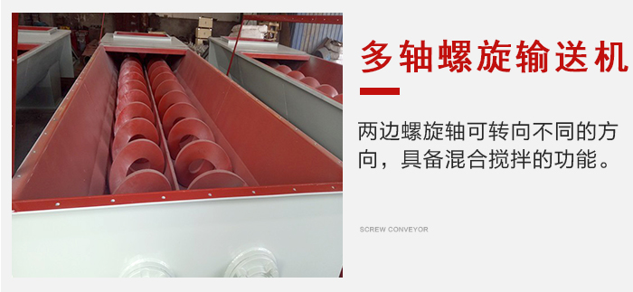 而多軸螺旋輸送機(jī)則是兩邊螺旋軸轉(zhuǎn)向不同的方向,具體混合攪拌的功能。