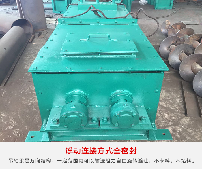 各傳動(dòng)部位都是采用浮動(dòng)連接方式,吊軸承是萬(wàn)向結(jié)構(gòu),使吊軸承、螺旋體和尾部總能形成一個(gè)整體的旋浮體,在一定范圍內(nèi)可以輸送阻力自由旋轉(zhuǎn)避讓,不卡料,不堵料。