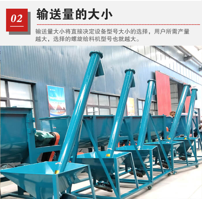 輸送量大小將直接決定設(shè)備型號(hào)大小的選擇,用戶所需產(chǎn)量越大,選擇的螺旋給料機(jī)型號(hào)也就越大,用戶需要結(jié)合自身對(duì)產(chǎn)量的需求來選擇合適的型號(hào)。