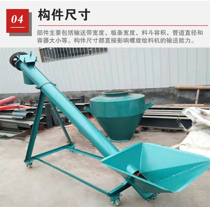 主要包括輸送帶寬度、板條寬度、料斗容積、管道直徑和容器大小等。這些構(gòu)件尺寸都直接影響螺旋給料機(jī)的輸送能力。如螺旋輸送機(jī)管徑越大,效率也就越高。當(dāng)然,并不一定就是輸送機(jī)本身才能影響效率,物料的各種性質(zhì)也都會(huì)對(duì)效率有所影響。