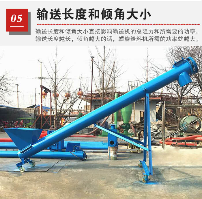 輸送長(zhǎng)度和傾角大小直接影響輸送機(jī)的總阻力和所需要的功率,輸送長(zhǎng)度越長(zhǎng),傾角越大的話,螺旋給料機(jī)所需的功率就越大,所以在選型時(shí)需要說明這一點(diǎn)。