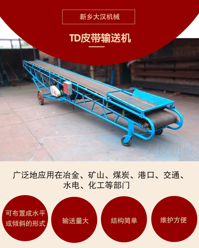 DTⅡ、TD75型皮帶由于輸送量大,結構簡單,維護方便,成本低,通用性強等優點,而被廣泛地應用在冶金、礦山、煤炭、港口、交通、水電、化工等部門,進行裝車、裝船、轉載或堆積各種常溫狀態的松散密度為500~2500kg/m3各種散狀物料或成件物品。由單機或多機組合成運輸系統來輸送物料,根據工藝要求可布置成水平或傾斜的形式,DTⅡ型皮帶輸送機除了可滿足水平或傾斜輸送要求外,還可采用帶凸弧段、凹弧段與直線段組合的輸送形式。輸送機允許輸送的物料塊度取決于帶寬、帶速、槽角和傾角,也取決于大塊物料出現的頻率。該輸送機適用的工作環境溫度一般為-25~+40℃。我公司還生產輕型皮帶輸送機和移動式輸送機。