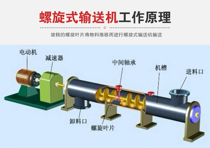 螺旋式輸送機的工作原理是旋轉的螺旋葉片將物料推移而進行螺旋式輸送機輸送,使物料不與螺旋式輸送機葉片一起旋轉的力是物料自身重量和螺旋式輸送機機殼對物料的摩擦阻力。