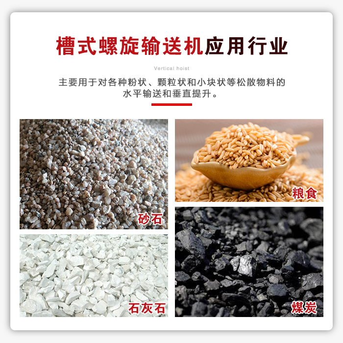 槽式螺旋輸送機是農(nóng)業(yè)各部門]機械化運輸工作的主要機組,可使運輸工作減輕勞動強度,提高工作效率,應(yīng)用范圍很廣。槽式螺旋輸送機適用于各行業(yè),如建材、化工、電力、冶金、煤炭、糧食等行業(yè),適用于水平或傾斜輸送粉狀、粒狀和小塊狀物料,如煤、灰、渣、水泥、糧食等。