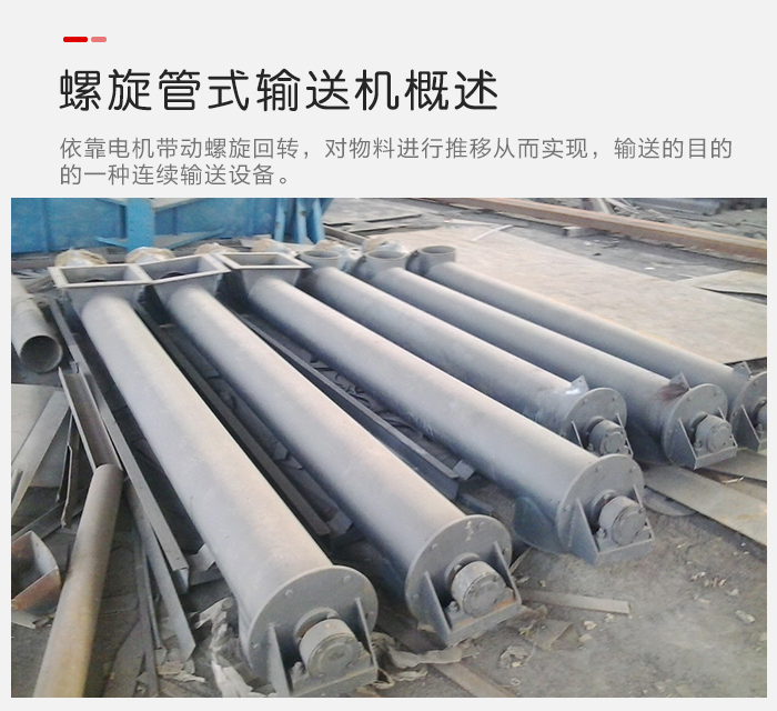螺旋管式輸送機是依靠電機帶動螺旋回轉,對物料進行推移從而實現,輸送的目的的一種連續輸送設備,可以水平,傾斜,垂直輸送粉末,顆粒及小塊狀物料。有結構電簡單,橫截面小,密封性好,操作方便,維修員容量的。