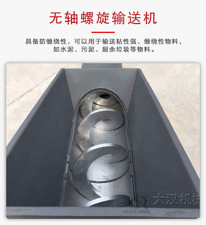 無軸螺旋輸送機采用了無中心軸設計,具備防纏繞性,可以用于輸送粘性強、纏繞性物料,如水泥、污泥、廚余垃圾等物料,可水平、傾斜輸送(傾斜角度不超過20°),大漢無軸螺旋輸送機可分為單無軸和雙無軸螺旋輸送機,還可根據輸送物料及應用場合分為碳鋼、不銹鋼材質。