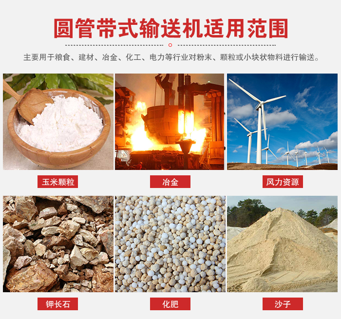 圓管帶式輸送機主要用于糧食、建材、冶金、化工、電力等行業(yè)對粉末、顆?;蛐K狀物料進行輸送任務,如水泥、混凝土、飼料、化肥、粉煤灰等物料,不宜輸送易變質(zhì)的、粘性大的、塊度大的及易結塊的物料。