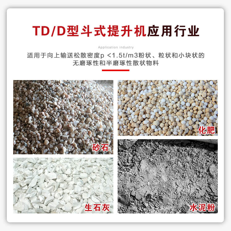 應用行業:TD型斗式提升機適用于向上輸送松散密度p <1.5t/m3粉狀、粒狀和小塊狀的無磨琢性和半磨琢性散狀物料 ,如煤、砂、焦末、水泥、碎礦石等。